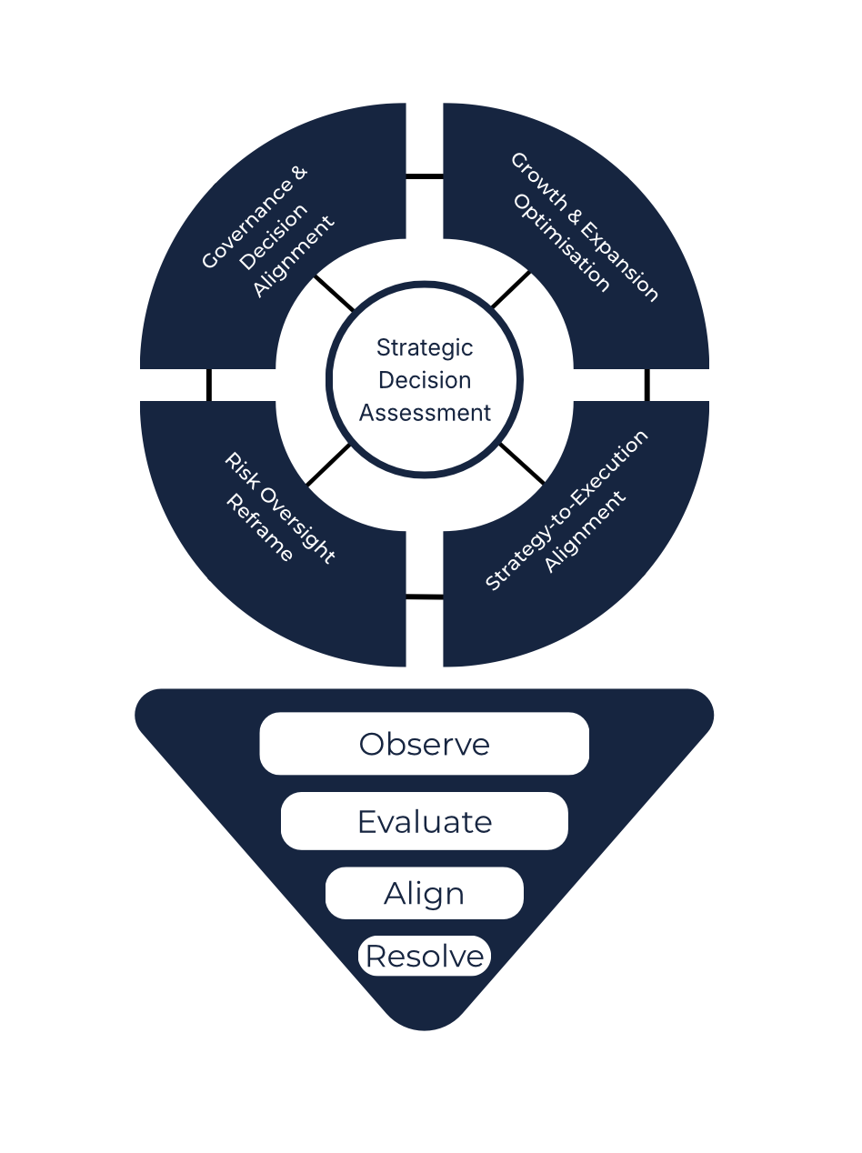 Our signature engagement, SDA, is applied where enterprise performance is constrained by uncertainty, misalignment, or structural complexity. It identifies and resolves the leadership decisions with the greatest impact within Growth Ambition, Strategy-Execution, Risk Management and Governance; often obscured by organisational structure, competing priorities, or incomplete visibility.